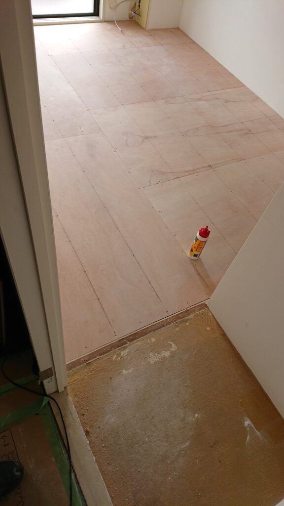 マンション特有のコンクリートスラブ下地のため、今回は直貼りフローリング工法を採用しました。
