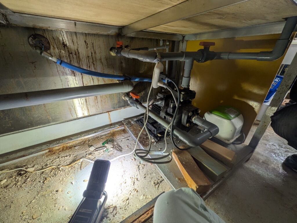 既存ポンプを慎重に取り外し、配管の状態も確認しました。